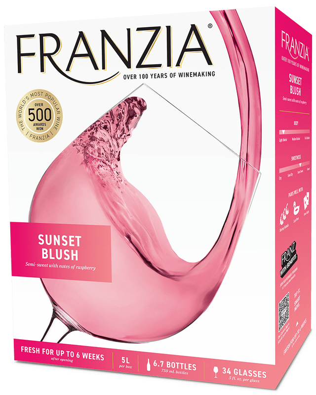 What sizes does Sunset Blush come in? Franzia Sunset Blush is widely available in the 5-liter box, which is the brand's signature format equivalent to approximately 34 glasses of wine.